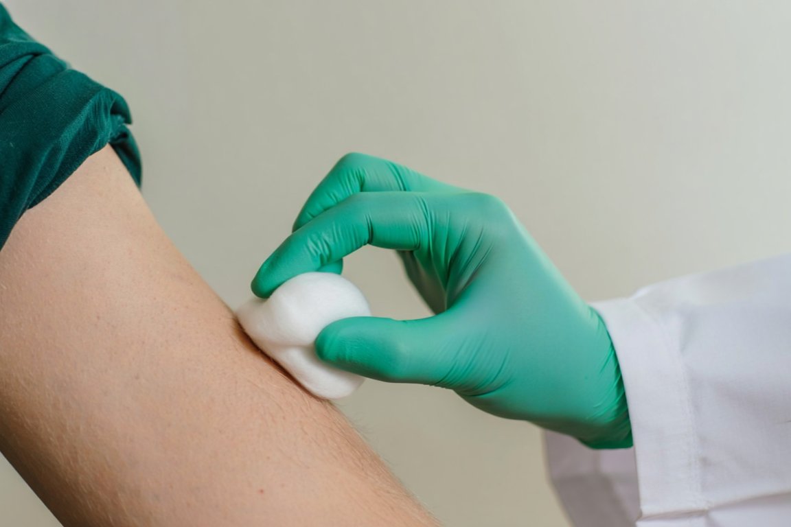 Врач обрабатывает область для укола ватным диском